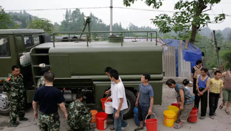 Le 21 mai, deux volontaires se rendaient au village de Xiang'e, dont les milliers de survivants étaient sous des tentes. Diagnostic fait, on pouvait utiliser une source comme approvisionnement. L'équipe locale les rejoignait en camion avec le matériel. Apres quelques travaux de terrassement, la ligne Aquaforce était installée puis renforcée par des camions citernes pour répondre à l'afflux de demande des environs. Dès le 24 mai, une deuxième station fonctionnait à Taguanje. La troisième Aquaforce allait arriver le 31 mai, avec deux volontaires français qui venaient prendre le relais de leurs collègues. Le 4 juin, elle était installée a Ci-Fong, pour alimenter 10 000 personnes. Les volontaires chinois allaient ensuite faire tourner les trois stations en se relayant tous les quinze jours.